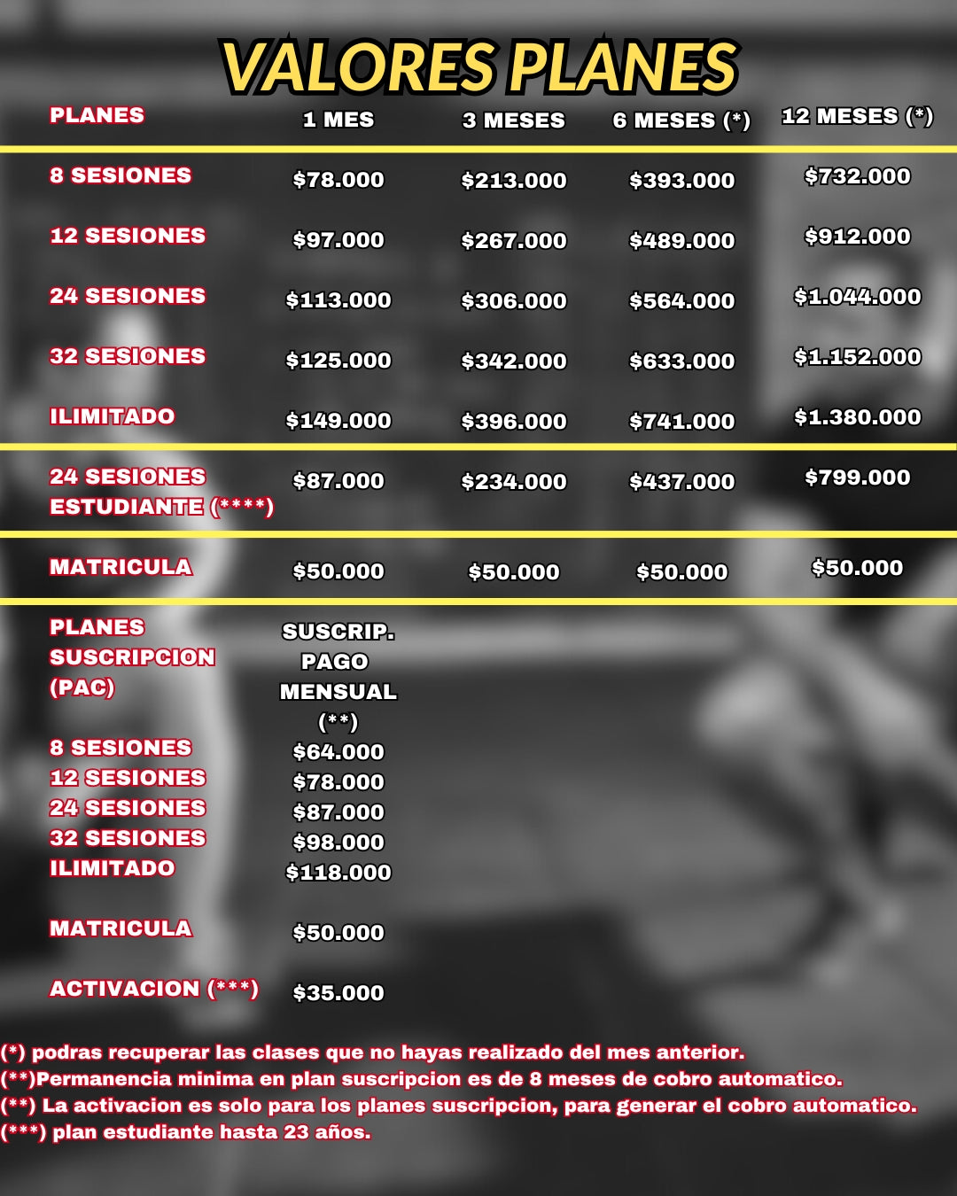 *Los planes suscripción y estudiante se contratan en el gimansio en persona.